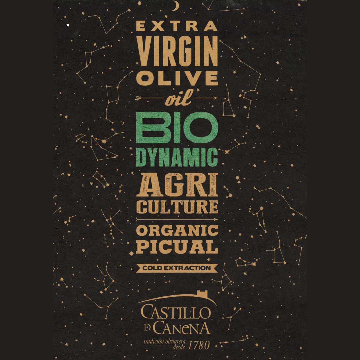 Our Biodynamic Arbequina EVOO is packaged in a rough-textured, natural-colored bottle, suggesting this concept of a return to the roots and the origins of rural activity with a constellation of stars and moon, the union of earth and heavens.